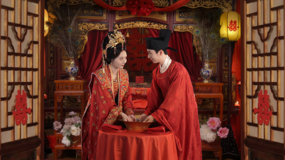 《鸾凤合鸣・华章启》秉持“传承不泥古,创新不离宗”的创作理念,完整复刻了古代婚礼的仪式,形成了可直接复用的标准化影像模板。从“三书六礼”的文书形制到“十大仪程”的走位规范,都经过了严谨细致的考据。在服化道具方面,团队查阅了众多资料,力求兼顾历史真实性与拍摄舒适度。