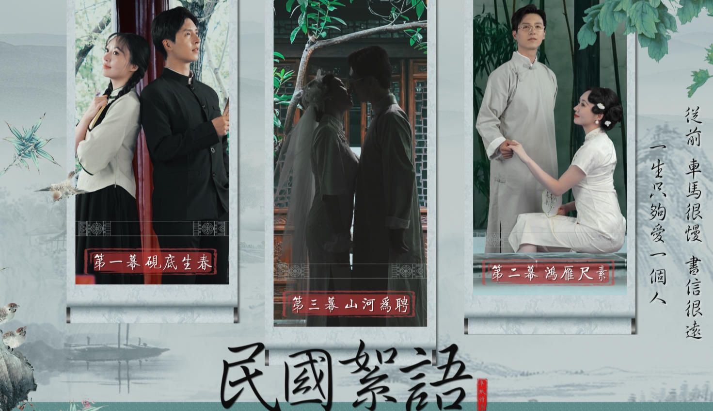 《民国絮语》以"初遇-离别-婚礼"的三幕式结构,讲述了一段始于雨巷廊亭、终于山河为盟的爱情传奇。第一幕"砚底生春"中,青石板路的雨痕与凉亭下的惊鸿一瞥,将学生时代的懵懂情愫定格成时光里的温柔注脚;第二幕"鸿雁尺素"通过八封泛黄信笺,演绎了乱世中"等我"二字背后的漫长守望;第三幕"山河为聘"则以一句"唯有死别,再无生离"的誓言,让跨越数载的等待终成圆满。